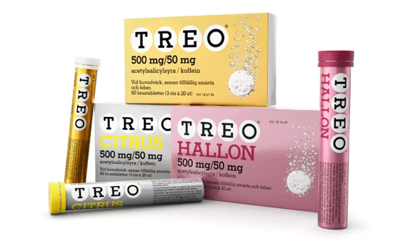 Treo (acetylsalicylsyra 500 mg/koffein 50 mg) är en receptfri brustablett