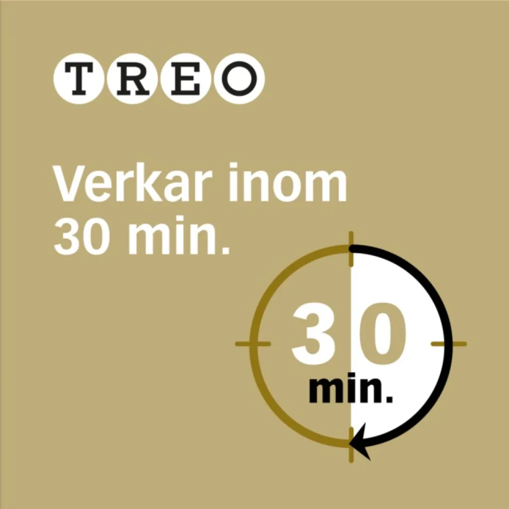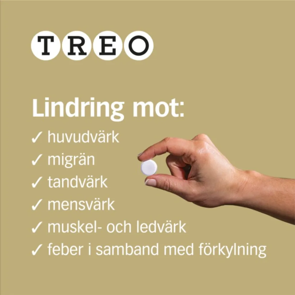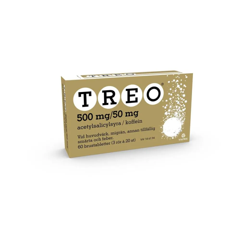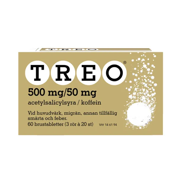 Treo är ett receptfritt läkemedel mot huvudvärk, migrän, tillfällig smärta och feber. Treo brustabletter innehåller 500 mg acetylsalicylsyra och 50 mg koffein – en kombination som ger snabb smärtlindring inom 30 minuter. Treo är smärtstillande, febernedsättande och antiinflammatoriskt och lindrar huvudvärk, migrän, mensvärk, tandvärk, muskelvärk, ledvärk och feber.