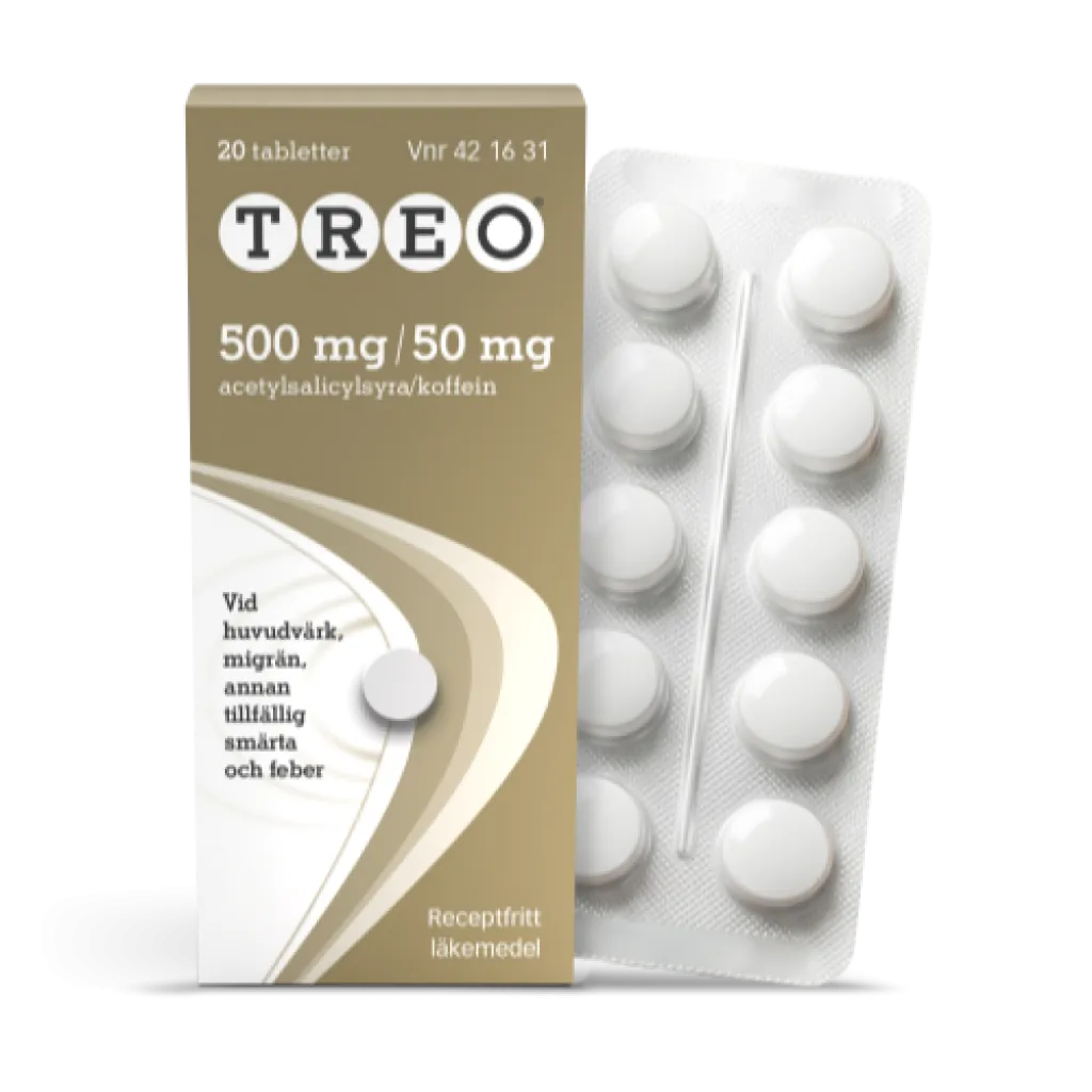 Treo tablett är ett receptfritt läkemedel mot huvudvärk, migrän, tillfällig smärta och feber. Treo tabletter innehåller 500 mg acetylsalicylsyra och 50 mg koffein - en kombination som ger snabb smärtlindring inom 30 minuter. Treo är smärtstillande, febernedsättande och antiinflammatoriskt.